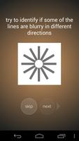 在測試中,您將獲得對象。應該確定不同方向上是否存在模糊零件。在測試結果結束時,將顯示該人是否分別對每隻眼睛都有散光。